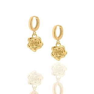 Kolczyki srebrne pozłacane z kwiatami róży. Zapinane na zatrzask. Całość wykonana ze srebra 925 pokrytego 24 karatowym żółtym złotem. Kwiat Róży (Róża): 11,4 x 13,1 mm; grubość: 2,5 mm Zapięcie na zatrzask: 11 mm Biż ...