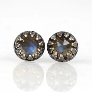 Ręcznie wykonane kolczyki ze srebra pokrytego ciemną oksydą z labradorytem. Z tyłu kolczyki wykończone pięknym kwiatowym wzorem. Każda para kolczyków unikatowo. …………………………………. WYMIARY średnica:
