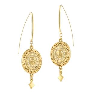 Pozłacane kolczyki Colibra by Sviatlana z kolekcji OLIMPIA, z monetą grecką, zdobioną kryształkami Preciosa. Długość kolczyków ok 8 cm. Średnica monetki 2,5 cm