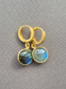 Kolczyki z pozłacanego srebra próby 925. Na biglach angielskich zostały zawieszone naturalne labradoryty średnicy około 1 cm. Jak widać na zdjęciach jeden labradoryt jest ciemniejszy w odcieniu granat ...