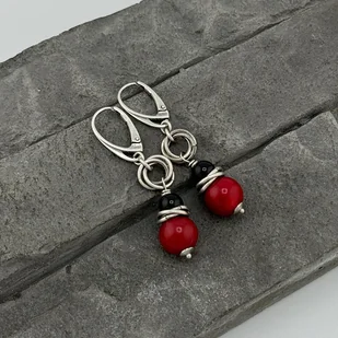 Kobiece kolczyki wykonane w całości z oksydowanego srebra próby 925 oraz kulek czerwonego korala wielkości ok. 12mm i kulek czarnego onyksu. Zapięcia zatrzaskowe typu angielskiego. Całkowita długość kolczykó ...