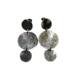 Kolczyki wykonane w całości ze srebra próby 925, w kształcie trzech połączonych ze sobą kół. Kolczyki wykończone oksydą grafitową. Powierzchni inspirowana strukturą skalną. Średnica kół:większego 2,2 cm mniejszego 1,2 ...