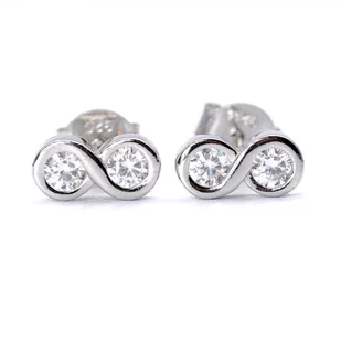 Srebrne kolczyki z motywem znaku nieskończoności z dwiema białymi cyrkoniami w środku. Wykonane z lśniącego srebra próba 925. Fabrycznie nowe.