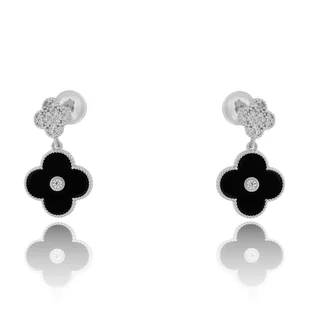 Srebrne kolczyki pr. 925 Wzór: Koniczynka Kamień: Onyks, cyrkonia Typ zapięcia: Sztyft Materiał: Srebro rodowane Powłoka: