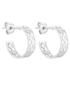 Srebrne małe kolczyki z ażurowym wzorem. Całość wykonana ze srebra 925. Zapinane na sztyft. Kolczyki posiadają zapięcia (baranki). Półkole 14 mm Szerokość 4 ...