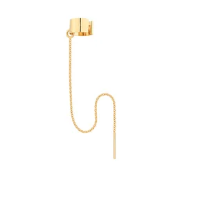 Złota nausznica z przewlekanym łańcuszkiem w całości wykonana ze srebra 925 powlekanego 24 karatowym żółtym złotem. Wysokość blaszki 6 mm Długość łańcuszka 10,5 cm Grubość łańcuszka 1 mm Produkt o wadze poniżej 5 g. ...