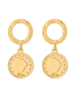 Złote kolczyki z chropowatym kółeczkiem i monetą. Zapinane na sztyft. Kolczyki posiadają zapięcia (baranki). Całość wykonana ze srebra 925 powlekanego 24 kar...