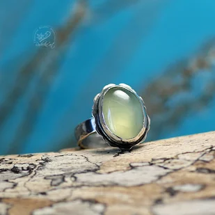 Klasyczny, elegancki pierścionek został wykonany ze srebra pr. 925 i 999. Sercem pierścienia jest kabaszon Prehnitu. Rozmiar kasety wynosi 14/18 mm. Szerokość obrączki wynosi 5 mm. Rozmiar 12-13.