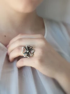 Pierścionek srebrny z dużą koniczynką.