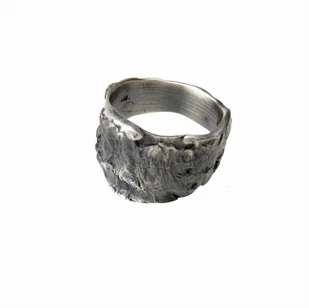 Okazały i wyrazisty pierścionek wykonany ze srebra o nieregularnej strukturze, niczym lawa wulkaniczna. Wykończony oksydą w kolorze grafitowym. Dostępny rozm...