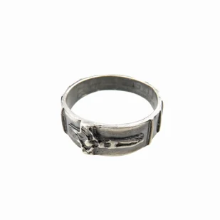 Piękna obrączka srebrna symbolizująca różaniec z uwidocznioną postacią ukrzyżowanego Jezusa. Całość została zoksydowana. Szerokość szyny: 5 mm. Waga: 5,2 g D...