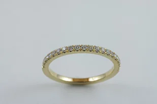Pierścionek w formie obrączki wykonany z żółtego złota próby 0,750 (18k) oraz naturalnych białych brylantów precyzyjnie osadzonych w oprawie castel na połowie obwodu. Dobrze wygląda samodzielnie lub w zestawie ...