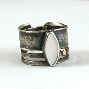 Pierścionek ze srebra, złota pr. 585 i masy perłowej. Srebro oksydowane, przetarte. Wielkość perły 0,5 - 1,3 cm, szerokość obrączki 1,5 cm. Rozmiar regulowany. Przy zamówieniu proszę o podanie rozmiaru, ...