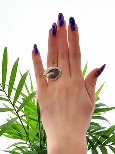 Wyjątkowy pierścionek srebrny, środek oksydowany. Wymiary góry 2 cm na 2,8 cm. Waga: 6,6 g Pierścionek z regulowaną obrączką. Prosta forma, elegancka i niezw...