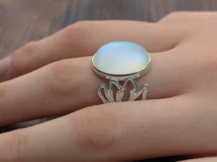 Średnica: regulowana w zakresie rozmiarów 14 - 15 Pierścionek Kamień Księżycowy Wyjątkowy, ażurowy pierścionek został wykonany ze srebra najwyższej próby 925. Regulowany pierścionek ozdobiony dużym szkliwionym kamieniem imitującym kamień księżycowy. Niezależnie od tego, czy ubierasz się na specjalne wydarzenie, czy dodajesz odrobinę blasku swojemu codziennemu wyglądowi, ten pierścionek jest idealnym wyborem. Idealny pomysł na oryginalny prezent!