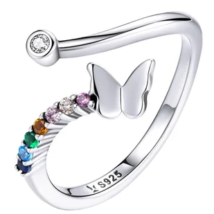 Pierścionek regulowany przedstawiający motylka i ozdobiony kolorowymi cyrkoniamii najwyższej jakości. Idealny pomysł na oryginalny prezent!