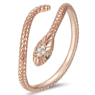 Pierścionek przedstawia zwiniętego węża z zielonymi oczami wysadzanymi cyrkoniami najwyższej jakości. Idealny pomysł na prezent!