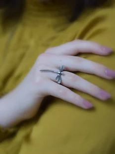 Uroczy pierścionek w kształcie ważki wykonany z oksydowanego srebra. Długość ważki 3,2 cm, szerokość skrzydełek 2,8 cm. Waga 4,0 gr. Zachwycający, oryginalny...
