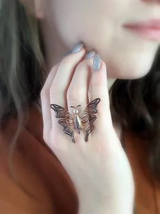 Kolor: Złoto-brązowy - wyrazisty i unikalny. Wymiary: Długość motyla 3,5 cm, szerokość skrzydełek 4,1 cm - imponujący rozmiar dla efektownego wrażenia. Waga: 7,2 grama - solidny, ale wygodny w noszeniu. Obrączka: Regulowana - zapewnia idealne dopasowanie do każdej dłoni. Dlaczego Nasz Pierścionek Motylkowy? Wyjątkowy Design: