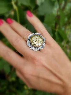 Dane Techniczne: Materiał: Srebro próby 925 Wykończenie: Pozłacane Szerokość kwiatka: 2 cm Rodzaj obrączki: Regulowana Waga: