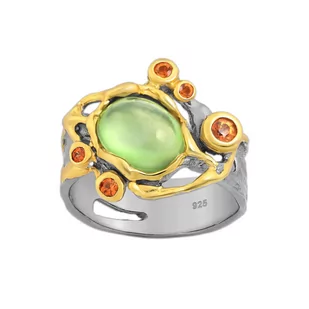 Przyciągający wzrok efektowny pierścionek z frenitem i szafirami. Kamienie są po prostu cudowne, o pięknym szlifie i nasyconej barwie.