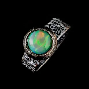 Pierścień z oprawionym w srebro pr. 925 opalem etiopskim. Średnica oprawy 9 mm. Waga 4,2 g. Obrączka w rozmiarze jubilerskim 17, bez możliwości powiekszenia, szerokość 5 mm. Pierścień zostanie wysłany w ...
