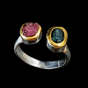 Dwa ciekawe okazy turmalinów, o barwie morskiej toni w oprawie 9 x 7 mm oraz różowy, surowy o średnicy oprawy 8 mm. Srebro próby 925, oprawa srebra wokół kamieni pozłacana, to delikatne powłoki, które z ...