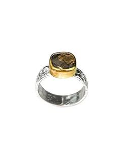 Pierścionek wykonany ręcznie. Fasetowany kwarc dymny, został osadzony w złoconej oprawie na szerokiej, lekko pękatej obrączce o fakturowanej powierzchni. Srebro pr. 925. Oprawa kamienia złocona 24k złotem ...
