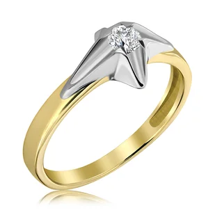 Przepiękny <strong>dwukolorowy złoty pierścionek zaręczynowy</strong> z centralnie umieszczonym delikatnym brylantem. Oprawa wykonana jest w dwukolorowym wariancie w formie tzw. nakładanej rozety. Kamyczek został oprawiony w białej koronie za pomocą czterech łapek. Korona wraz z kamyczkiem została nałożona w szynę pierścionka.