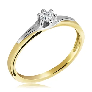 Przepiękny <strong>fantazyjny dwukolorowy złoty pierścionek zaręczynowy</strong> z centralnie umieszczonym brylantem. Oprawa wykonana jest w dwukolorowym wariancie w formie tzw. koszyczka. Kamyczek został oprawiony w białym koszyczku za pomocą sześciu łapek. Koszyczek z łapkami ukształtowano w formie nakładki na szynę. Łapki zostały ukształtowane w bardzo ciekawej i fantazyjniej formie.