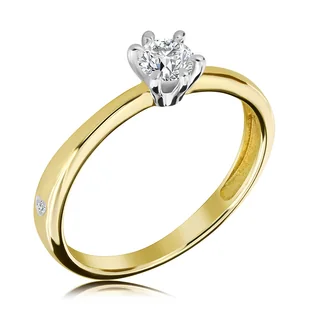 Przepiękny <strong>subtelny dwukolorowy złoty pierścionek zaręczynowy</strong> z centralnie umieszczonym okazałym brylantem. Oprawa wykonana jest w dwukolorowym wariancie w formie tzw. korony. Kamyczek został oprawiony w białej koronie za pomocą sześciu łapek. Koronę zestawiono z delikatną szyną, która zwęża się ku oprawie. Po obu stronach szyny w szerszej części wkomponowano dwa białe serduszka, w których oprawiono dwa malutkie brylanty.