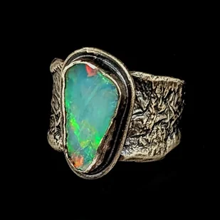 Stylizowany na retro pierścień z oprawionym surowym opalem etiopskim. Srebro pr. 925, oksyda. Wymiary oprawy 20 x 11mm. Waga 8 g. Obrączka w rozmiarze jubilerskim 15, szerokość 14 mm, mogę powiększyć na rozm ...