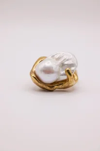 Ręcznie wykonany sygnet metodą wosku traconego. Materiał: mosiądz + perła naturalna baroque. Każda perła użyta do pierścionka jest naturalna i inna, może różnić się od tej na zdjęciu. Wielkosc perły ok 2,3 x1,5 cm ...