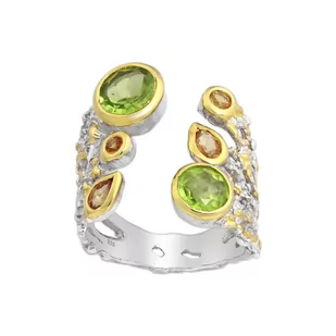 Przyciągający wzrok efektowny pierścionek z peridotem i szafirami. Kamienie są po prostu cudowne, o pięknym szlifie i nasyconej barwie.
