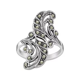 Niezwykle efektowny pierścionek z pięknymi markazytami o cudownym diamentowym blasku. Zdjęcie nie oddaje nawet w części piękna tego pierścionka. Gwarantujemy , że Pani lubująca się w szerokich pierścionkach - obrączkach będzie bardzo zadowolona z zakupu. Wykonany został z oksydowanego srebra w najwyższej próbie 925. Pierścionek okazale się prezentuje. Doskonała ozdoba dla Pań, które cenią wyjątkową jakość i unikatowość. Przyszła właścicielka tego pierścionka będzie z niego naprawdę zadowolona.