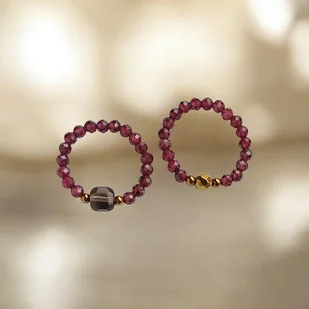 Zestaw 2 pierscionków w dobrej cenie:) Pierścionki elastyczne zostały wykonane z drobniutkich kuleczek fasetowanego granatu (niecałe 3mm) oraz kostki fasetowanego kwarcu dymnego i przekładek ze złot ...