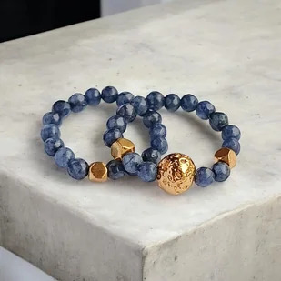 Zestaw 2 pierscionków w dobrej cenie:) Pierścionki elastyczne zostały wykonane z kuleczek fasetowanego jadeitu w szafirowym odcieniu granatu (3mm) oraz kuli platerowanej lawy i przekładek ze złotego hema ...