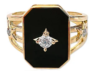 Złoty pierścionek duży czarny prostokąt zdobiony cyrkonią i drobnymi gwiazdkami. Parametry: Próba: złoto 585 Kolor: Żółte złoto Rozmiar pierścionka: 17 Wielk...