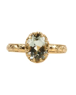 Ręcznie wykonany pierścionek z fasetowanym zielonym ametystem ze srebra pokrytego 24 karatowym złotem z przepięknie fakturowaną obrączką w kwiatowy wzór oraz ozdobną cargą wokół kamienia w stylu Vintage. …… ...