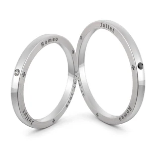 Niesamowite delikatne srebrne obrączki o profilu lekko zaokrąglonym o powierzchni polerowanej i satynowanej wzdłużnie. Nieco grubsze, ale wąskie klasyczne obrączki przyozdobione niespotykaną grawerką umieszczoną na bocznym profilu obrączki. Na fotografii umieszczono grawer imion - Romeo, Juliet oraz datę zaślubin 27.07.2019. Pomiędzy imionami i datą dodatkowo wygrawerowano delikatne krzyże. Charakter obrączek podkreślono subtelną oprawą biało czarnych kamyczków.