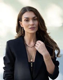 Naszyjnik wykonany z pozłacanej stali szlachetnej oraz stali szlachetnej w kolorze czarnym. Obwód łańcuszka: 66cm. , długość części wiszącej: 16m. Biżuteria ozdobnie zapakowana. Do kompletu można dokupić kol ...