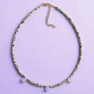 Naszyjnik na solidnej lince stalowej (miękkiej) - został wykonany z drobnych kuleczek jaspisu dalmatyńskiego ok. 3mm, trzech kropli fioletowego jadeitu ok.10mm oraz przekładek ze złotego hematytu. Wszy ...
