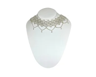 Posrebrzany koronkowy choker, zdobiony falbanką z łańcuszka, wyklejany kryształkami Preciosa.