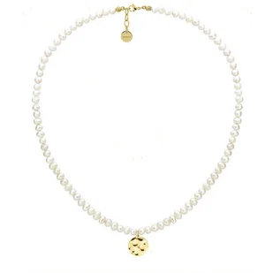 Naszyjnik damski typu choker z subtelnych pereł hodowlanych w kolorze białym z medalionem o ciekawej, młotkowanej strukturze. Elementy pozłacane są trwałą metodą PVD, która nadaje biżuterii piękny kolor 14k złota. Minimalistyczna forma zrównoważona ponadczasową klasyką nada szyku każdej kobiecie. AMULET OCHRONNY