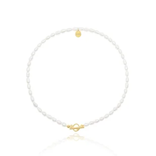 Choker z naturalnych pereł. Całość wykonana z naturalnych pereł słodkowodnych w kolorze białym, logo i zapięcie toggle wykonane ze srebra 925 pokrytego 24 karatowym żółtym złotem. Perły (unikatowe): 5 - 6 mm Ozdobne zapięcie: Kółko: 9 mm Pałeczka: