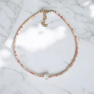 Dostępne zaledwie kilka egzemplarzy! Minimalistyczny naszyjnik na solidnej lince stalowej (miękkiej) - został wykonany z fasetowanych kuleczek awenturynu łososiowego 3mm oraz serduszka z kryształu górs ...