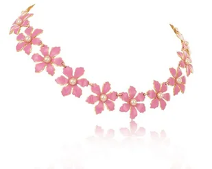 Pozłacany naszyjnik z ręcznie malowanych różowych kwiatów.