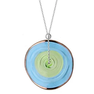 Unikalny naszyjnik ze szkła i stali szlachetnej, który zachwyca swoją oryginalnością! Ten designerski naszyjnik składa się z geometrycznego, falowanego, szklanego dysku w pastelowym odcieniu zielonego i niebieskiego, zawieszonego na substelnym i eleganckim łańcuszku z hipoalergicznej stali szlachetnej. Kolekcja powstała z inspiracji twórczością Wassily’ego Kandinsky’ego, prekursora sztuki abstrakcyjnej, który wierzył, że kolory i kształty mogą wywoływać emocje i wpływać na nastrój. Jego słynne "Kwadraty z koncentrycznymi okręgami" stały się punktem wyjścia do stworzenia u