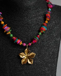 MEGA kolorowy i okazały naszyjnik z barwionej MASY PERŁOWEJ (muszli) i złotego HEMATYTU, z przepiękną zawieszką w kształcie dużego kwiatu. Zawieszka, zapięcie i łańcuszek to STAL SZLACHETNA w kolorze złotym. Te ...