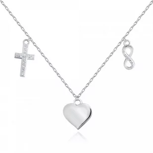 Naszyjnik srebrny Naszyjnik został wykonany z wysokiej jakości srebra próby 925 . Splot łańcuszka oparty jest na regularnych ogniwach o szlifowanej powierzchni, cechującej się wysoką odpornością na urazy mechaniczne. Jego długość regulowana jest w zakresie 41-44 cm za pomocą powiększonych ogniw umieszczonych w końcowej części. W centrum znajdują się delikatne aplikacje w formie serca, krzyżyka i symbolu nieskończoności. Długość naszyjnika: